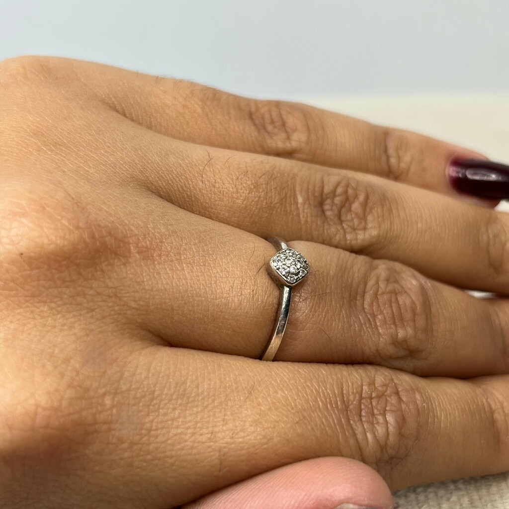 Detalhes: Anel delicado e sofisticado com design minimalista. Possui aro fino em metal prateado e um topo em formato levemente quadrado com bordas suaves, cravejado com microzircônias que proporcionam um brilho discreto e elegante. Ideal para quem busca um acessório sutil, versátil e atemporal, perfeito para uso diário ou para compor mix de anéis com estilo refinado.