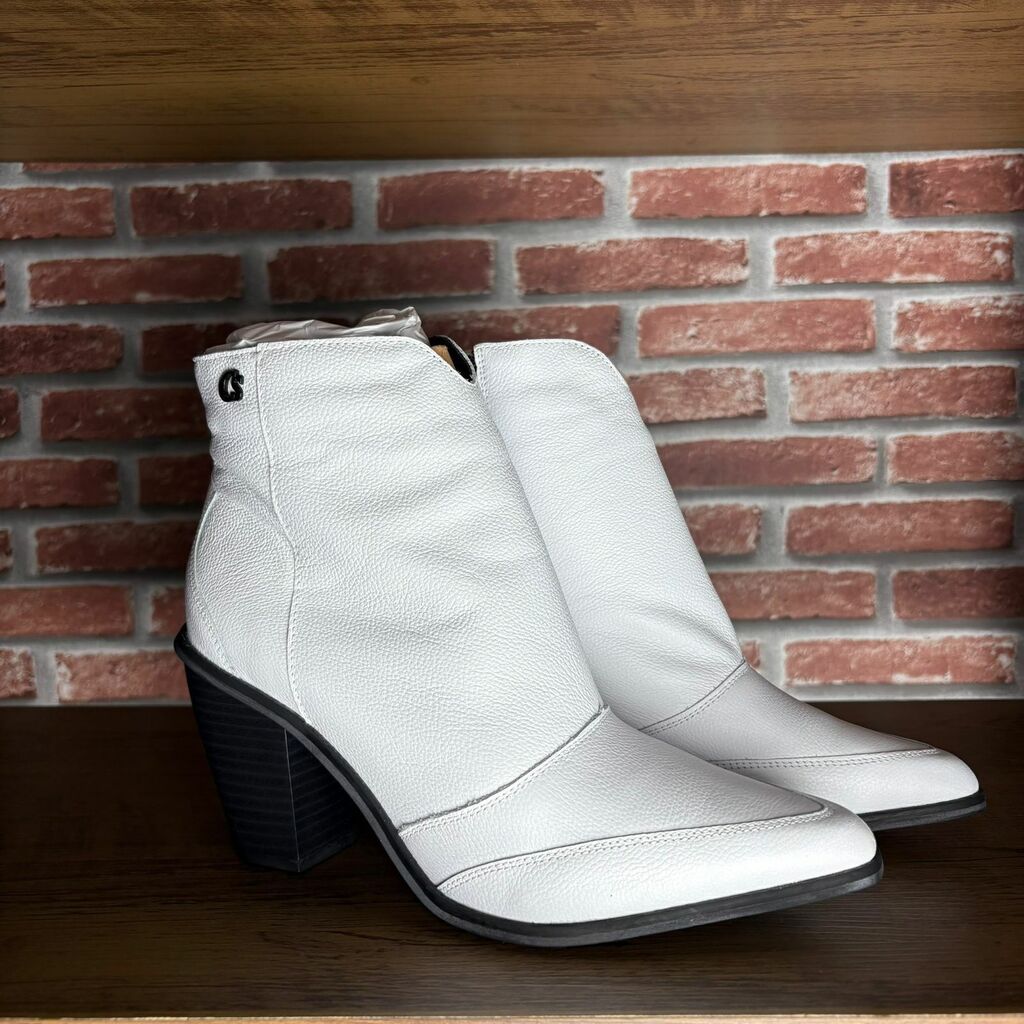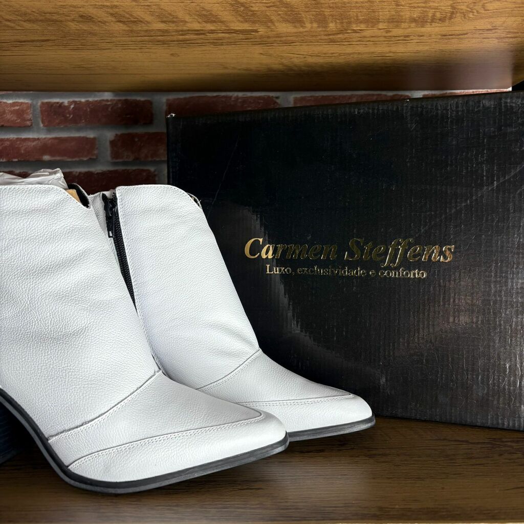 Detalhes: Bota de couro legítimo da marca Carmen Steffens, com bico levemente fino, salto grosso alto e acabamento texturizado. O modelo em tom branco oferece um visual elegante e moderno, ideal para composições sofisticadas tanto para o dia quanto para a noite. Destaque para o detalhe metálico com a logo “CS” próximo à parte superior, que reforça a identidade da marca. Fechamento lateral em zíper.