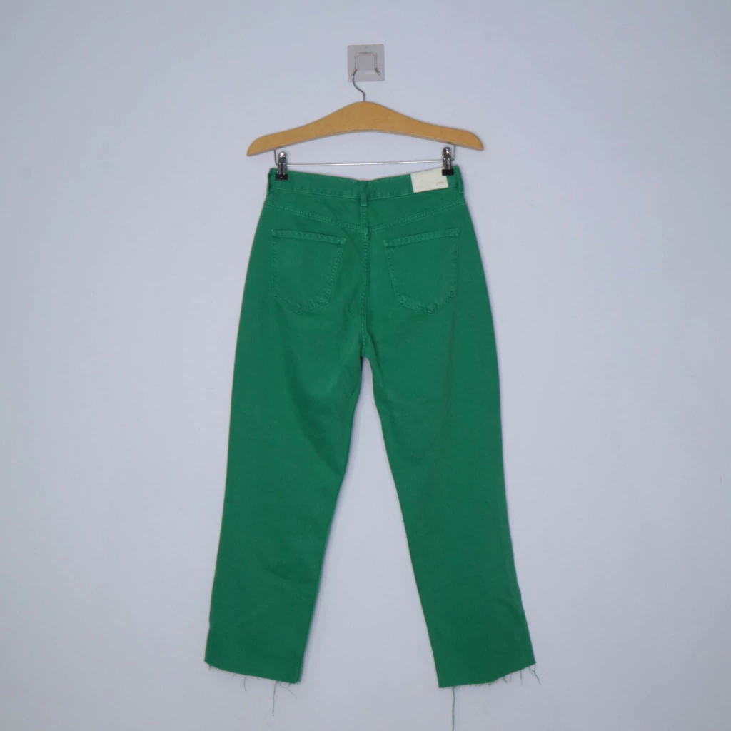 Detalhes: Calça feminina em tom vibrante de verde, confeccionada em tecido de algodão com corte reto. O modelo apresenta cintura média, acabamento desfiado na barra e fechamento com zíper e botão. Perfeita para composições modernas e despojadas, combinando estilo com conforto para o dia a dia.