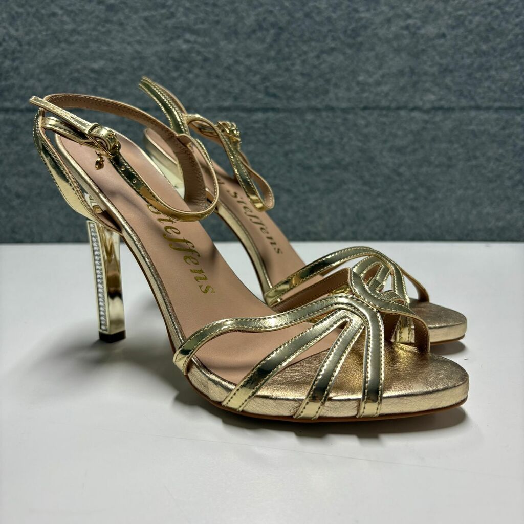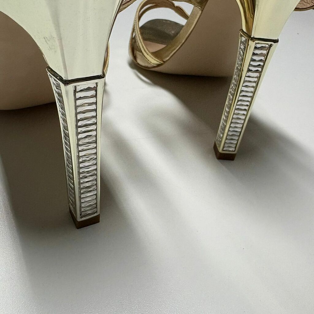 Detalhes: Sandália Carmen Steffens em tom dourado com acabamento metalizado, design sofisticado e tiras entrelaçadas no cabedal. Possui salto bloco alto revestido com aplicações espelhadas que trazem um toque de glamour ao visual. Conta com fechamento em fivela lateral ajustável e palmilha acolchoada que garante conforto. Ideal para eventos noturnos ou ocasiões especiais.