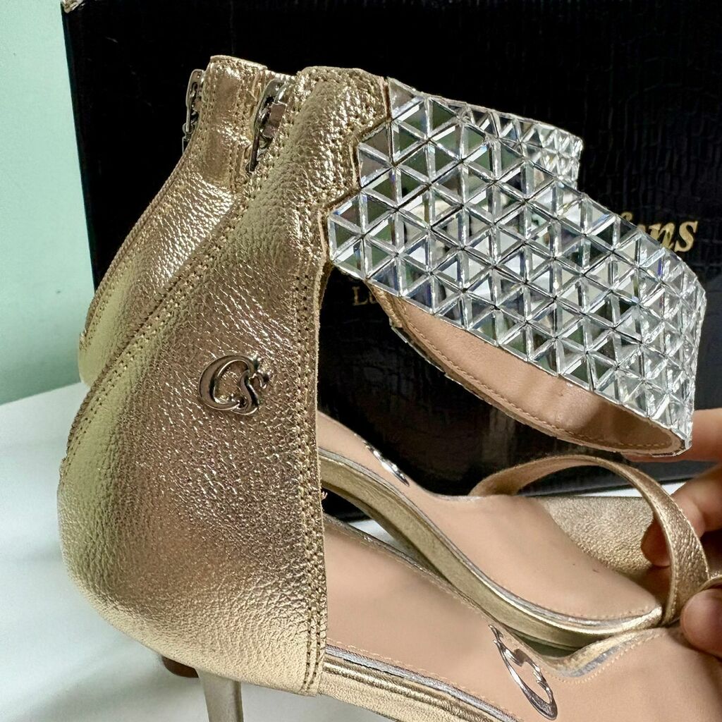 Detalhes: Sandália Carmen Steffens dourada com acabamento metalizado, tira fina sobre os dedos e tornozeleira larga em material espelhado geométrico, que traz um visual marcante e sofisticado. Possui salto médio em formato taça, que garante estabilidade com elegância. Fechamento em zíper traseiro. Ideal para eventos noturnos e produções glamorosas.
