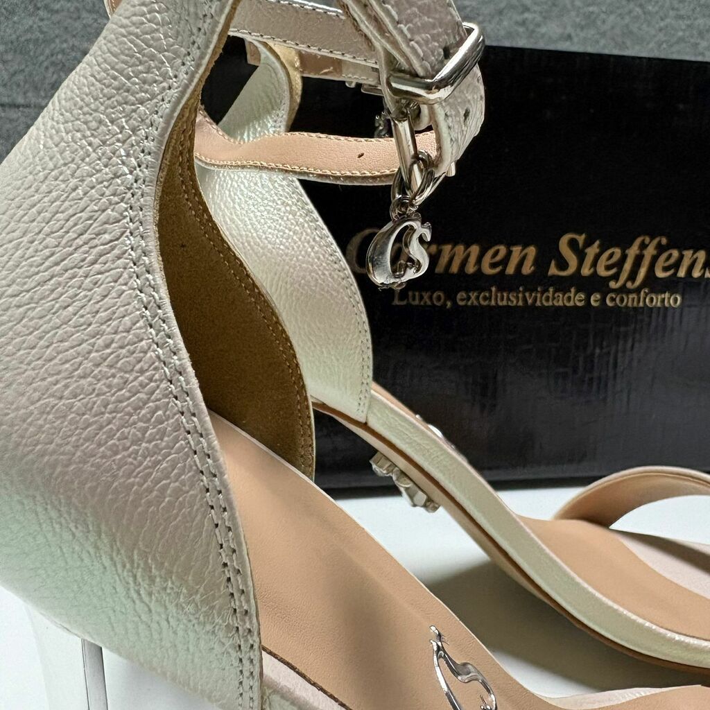 Detalhes: Sandália elegante da marca Carmen Steffens, confeccionada em material perolado com acabamento texturizado na cor off-white. O modelo possui tira única sobre os dedos e fechamento por fivela no tornozelo, adornada com pingente metálico “CS”. O salto fino metalizado confere sofisticação e leveza ao visual. Destaque para o detalhe interno com aplicação de pantera e cristal, símbolo da marca, que reforça a exclusividade da peça. Ideal para eventos formais, casamentos ou produções noturnas, une conforto, glamour e identidade marcante.