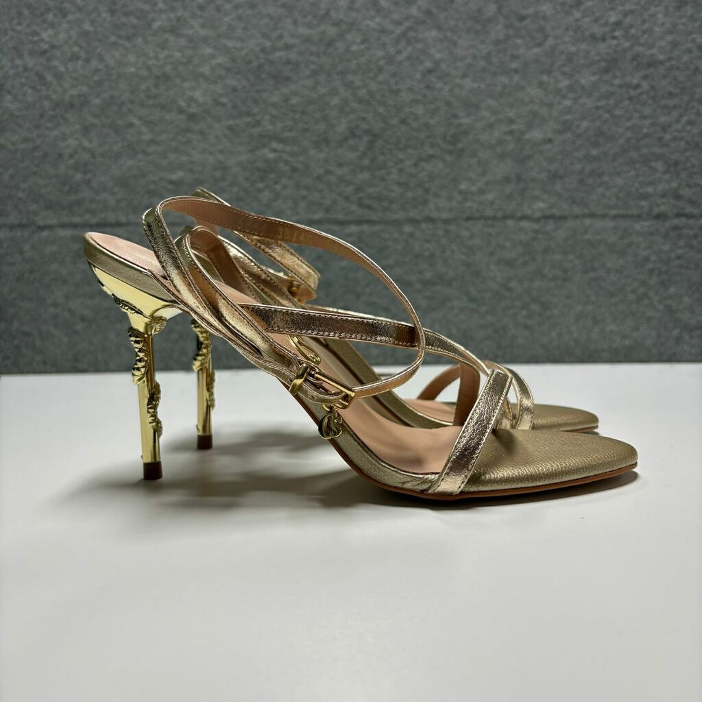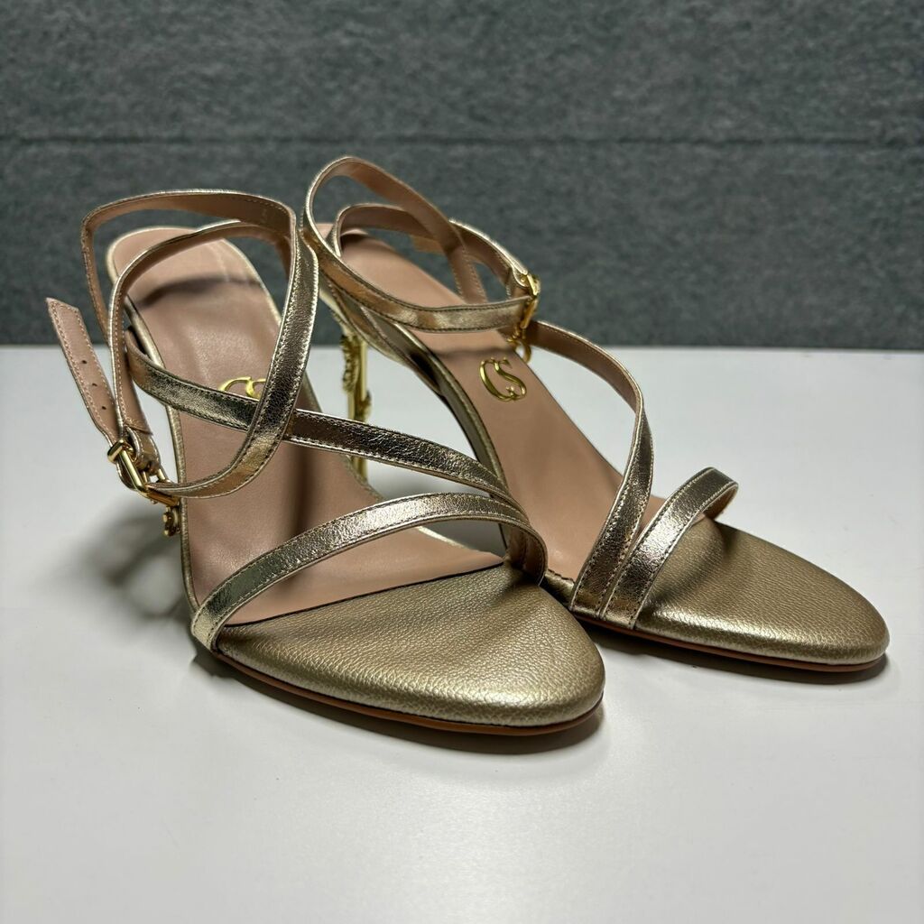 Detalhes: Sandália Carmen Steffens em tom dourado metalizado, com tiras finas e delicadas que valorizam o pé. O destaque fica por conta do salto alto esculpido com detalhe de cobra em metal, trazendo sofisticação e ousadia ao design. Fechamento por fivela no tornozelo e acabamento elegante. Ideal para produções noturnas ou ocasiões especiais que pedem um toque de exclusividade.