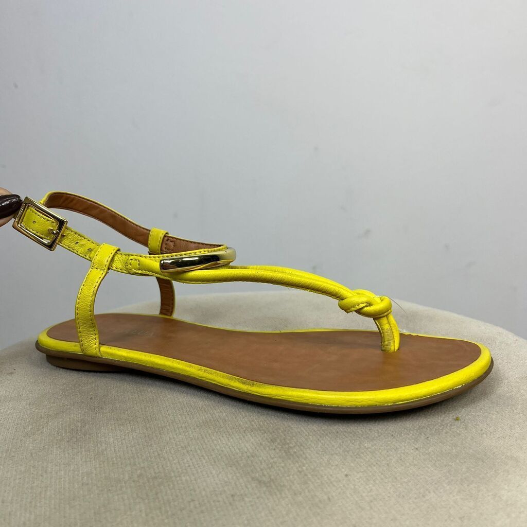 Detalhes:Sandália rasteira confeccionada em material de acabamento refinado, apresentando tiras finas revestidas em amarelo vibrante e detalhe metálico central que adiciona sofisticação ao design. O modelo possui tiras ajustáveis com fivela lateral para melhor encaixe, além de palmilha em tom natural que garante conforto ao caminhar. A frente conta com nó decorativo, reforçando o visual moderno e delicado da peça. Ideal para composições casuais elegantes, trazendo leveza e cor aos looks de verão.
