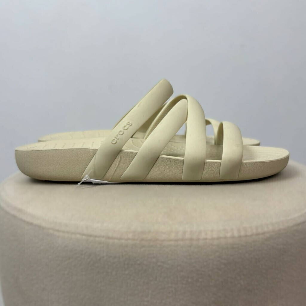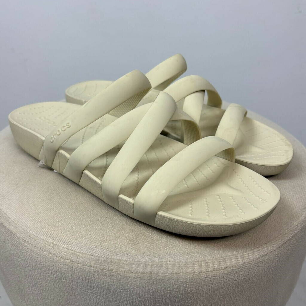Detalhes: Sandália slide da marca Crocs confeccionada em material emborrachado leve e confortável na cor bege. Possui design com tiras cruzadas no cabedal, palmilha texturizada anatômica e solado levemente elevado, proporcionando maciez e amortecimento a cada passo. Ideal para o dia a dia ou momentos de lazer, oferece estilo casual com o conforto característico da Crocs.