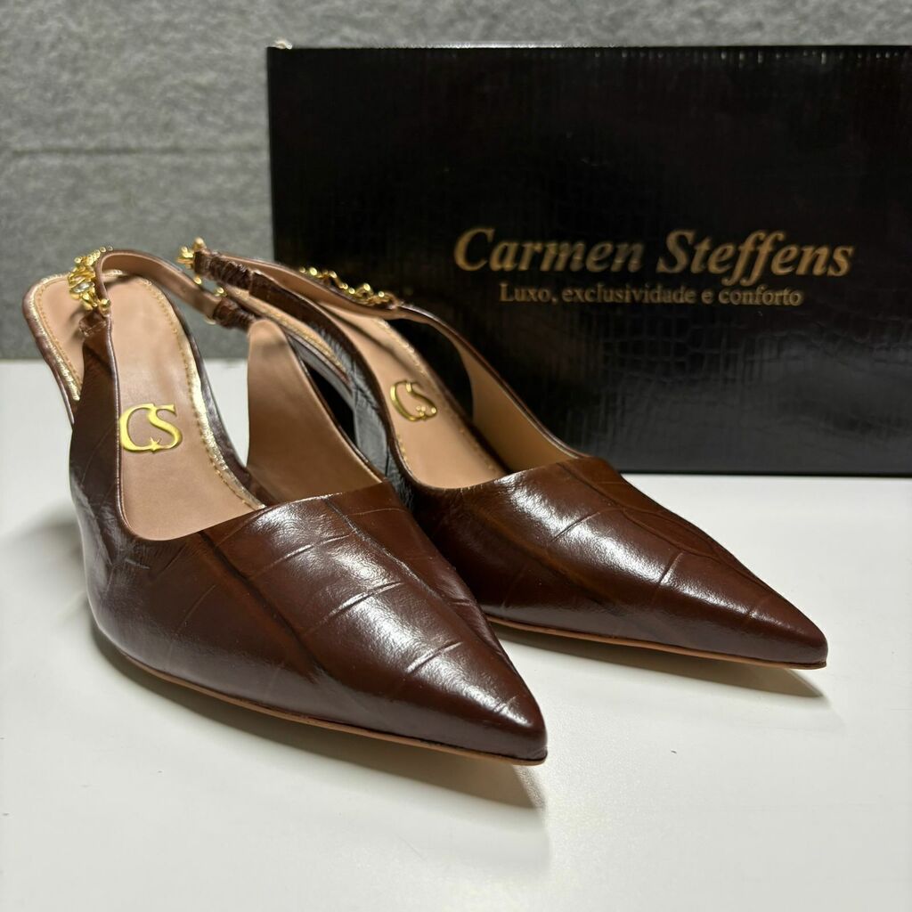 Detalhes: Scarpin slingback da marca Carmen Steffens confeccionado em material com textura croco na cor marrom. O modelo possui bico fino e tira traseira com elástico embutido para melhor ajuste, decorada com corrente dourada e detalhe de cristal e logotipo “CS”, agregando sofisticação e brilho à peça. O salto médio fino proporciona elegância com conforto, ideal para compor looks refinados do dia à noite. Uma peça marcante que une estilo clássico e acabamento de alto padrão.