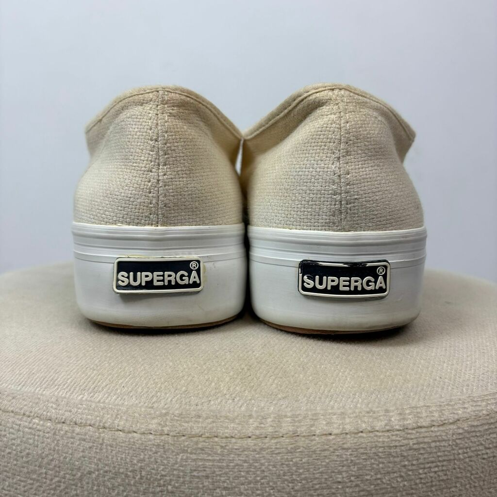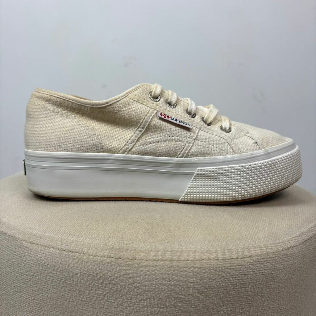 Detalhes: Tênis feminino da marca Superga, confeccionado em tecido canvas resistente na cor off-white. Modelo com solado plataforma emborrachado branco, proporcionando leve elevação e estilo moderno. Possui fechamento por cadarço e etiqueta lateral com o logo da marca. Clássico e versátil, é ideal para compor looks casuais e confortáveis no dia a dia.