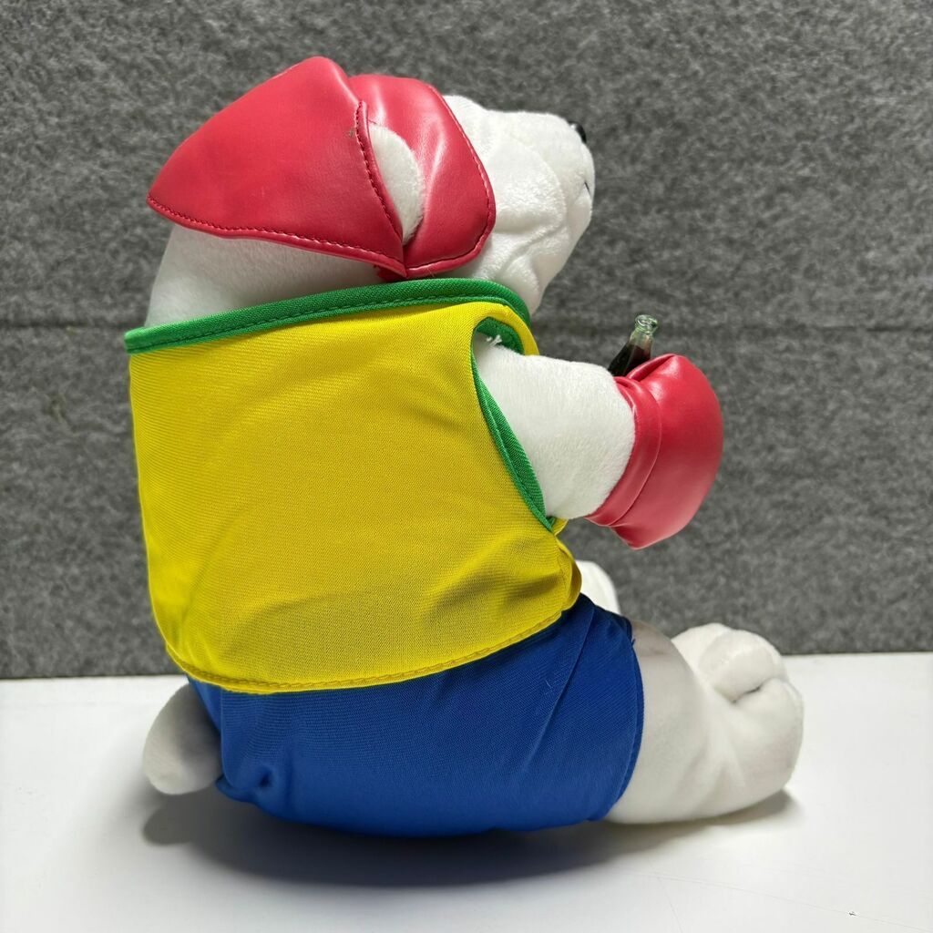 Urso de pelúcia temático da Coca-Cola, vestido como boxeador, com short azul, camiseta amarela com estampa da marca e luvas de boxe vermelhas. A peça conta ainda com protetor de cabeça e uma mini garrafa de Coca-Cola costurada à mão. Item colecionável e divertido, ideal para fãs da marca ou para presentear. Em ótimo estado de conservação, perfeito para decorar ambientes com estilo retrô ou esportivo.