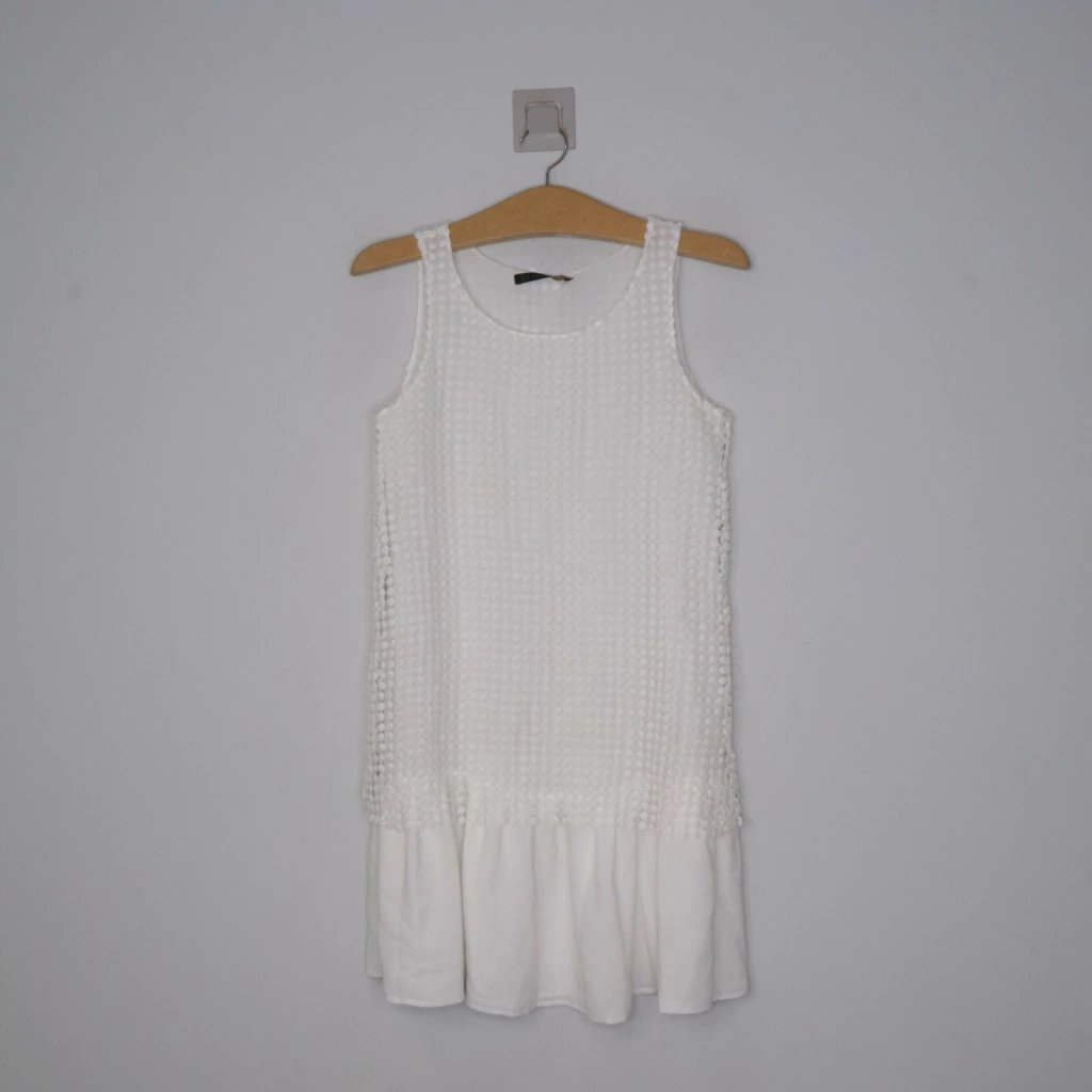 Detalhes: Este vestido da marca Zara apresenta um design leve e feminino, com um acabamento que mescla o crochê e tecido liso. Ele é confeccionado na cor branca, destacando-se pelo corpo em crochê texturizado, composto por detalhes circulares que criam um padrão interessante e sofisticado. O vestido é sem mangas, com alças médias, e possui uma saia em tecido liso na parte inferior, que adiciona movimento e contraste ao design